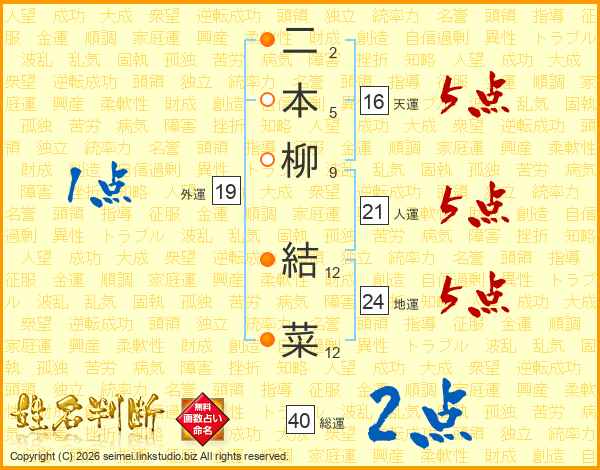 二(2画)本(5画)柳(9画) 結(12画)菜(12画)