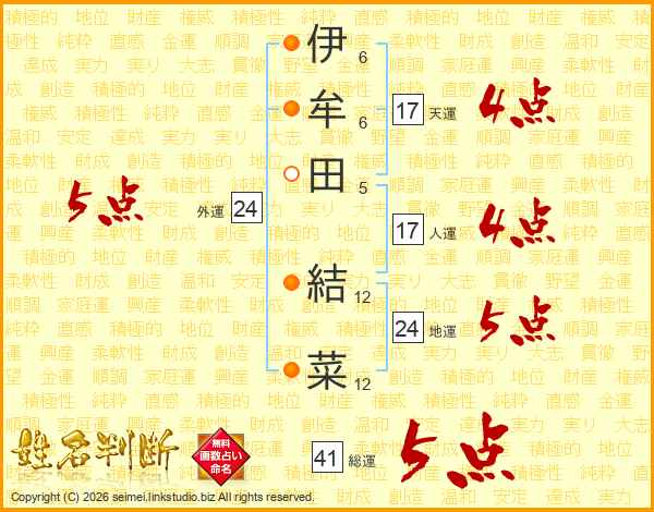 伊(6画)牟(6画)田(5画) 結(12画)菜(12画)