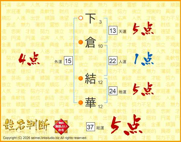 生活面を象徴する運勢です。外部から受ける影響力を表し、結婚運、家庭運や職場、環境への順応性を表します。総運から人運を引いた画数。姓や名が1文字の場合を除く。
