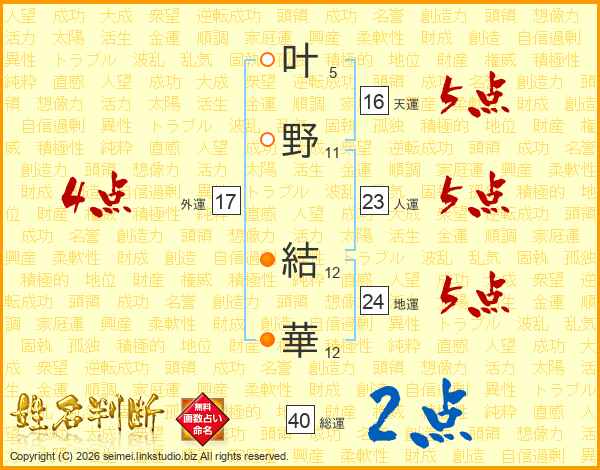 生活面を象徴する運勢です。外部から受ける影響力を表し、結婚運、家庭運や職場、環境への順応性を表します。総運から人運を引いた画数。姓や名が1文字の場合を除く。