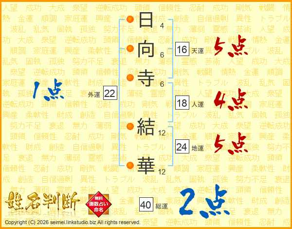 日(4画)向(6画)寺(6画) 結(12画)華(12画)