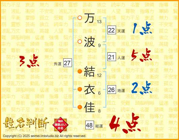 万(13画)波(9画) 結(12画)衣(6画)佳(8画)