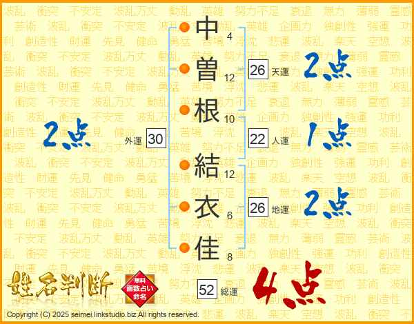 中(4画)曽(12画)根(10画) 結(12画)衣(6画)佳(8画)