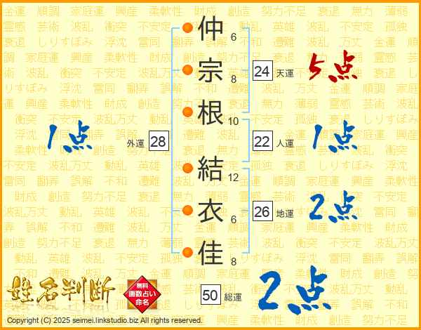 仲(6画)宗(8画)根(10画) 結(12画)衣(6画)佳(8画)