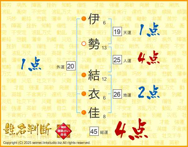伊(6画)勢(13画) 結(12画)衣(6画)佳(8画)