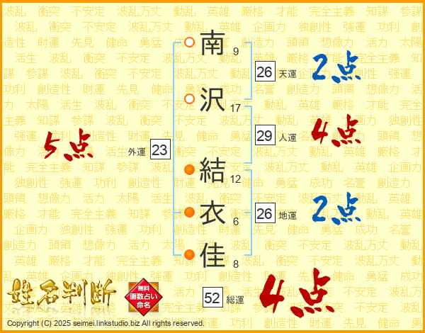 南(9画)沢(17画) 結(12画)衣(6画)佳(8画)