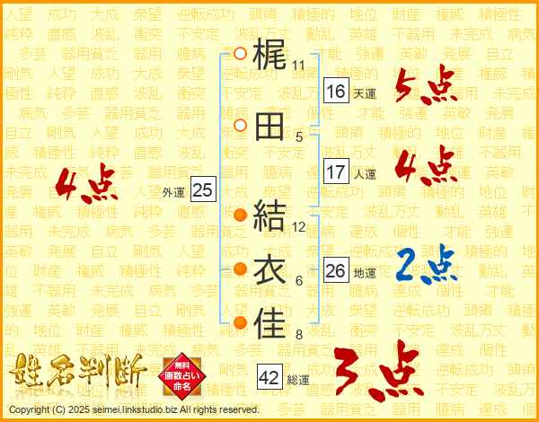梶(11画)田(5画) 結(12画)衣(6画)佳(8画)