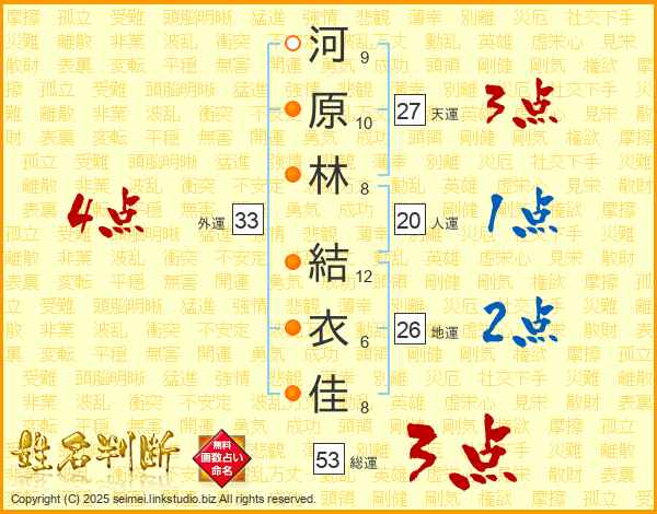 河(9画)原(10画)林(8画) 結(12画)衣(6画)佳(8画)
