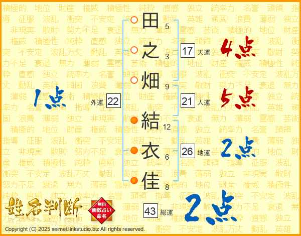 田(5画)之(3画)畑(9画) 結(12画)衣(6画)佳(8画)