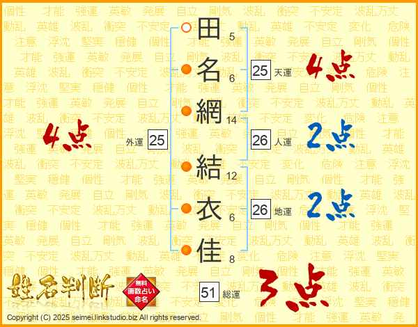 田(5画)名(6画)網(14画) 結(12画)衣(6画)佳(8画)
