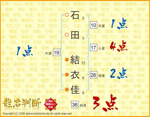 石(5画)田(5画) 結(12画)衣(6画)佳(8画)