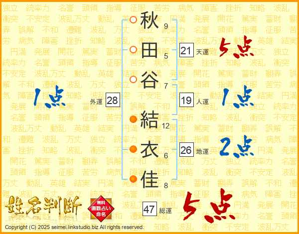 秋(9画)田(5画)谷(7画) 結(12画)衣(6画)佳(8画)