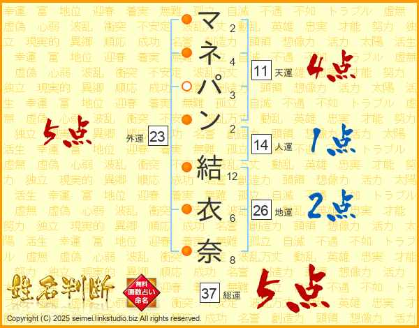 マ(2画)ネ(4画)パ(3画)ン(2画) 結(12画)衣(6画)奈(8画)