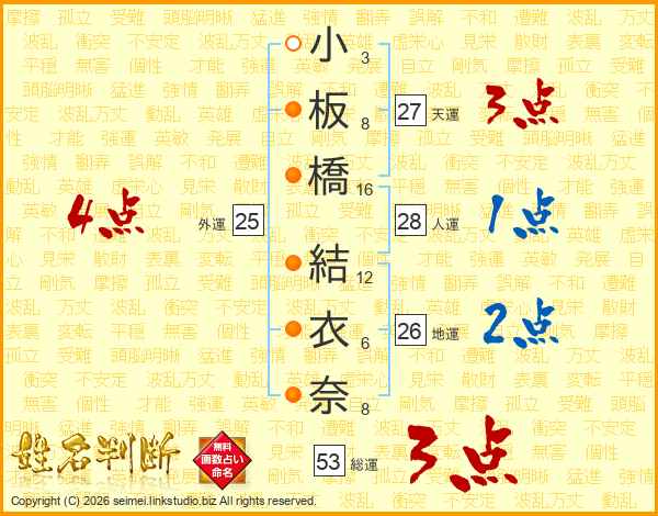 小板橋結衣奈さんの総運は53画の3点!