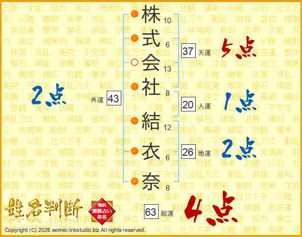 株式会社結衣奈さんの総運は63画の4点!