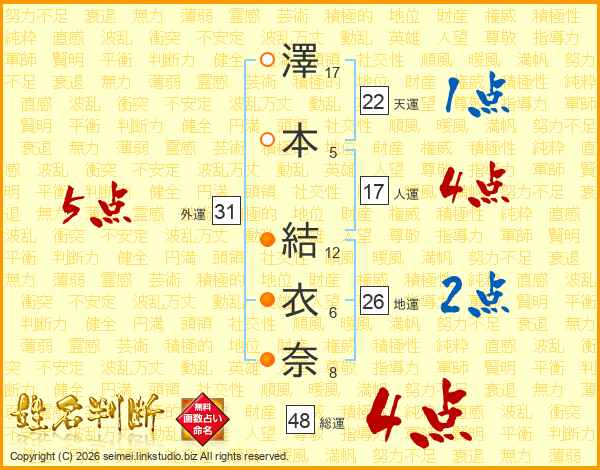 澤(17画)本(5画) 結(12画)衣(6画)奈(8画)