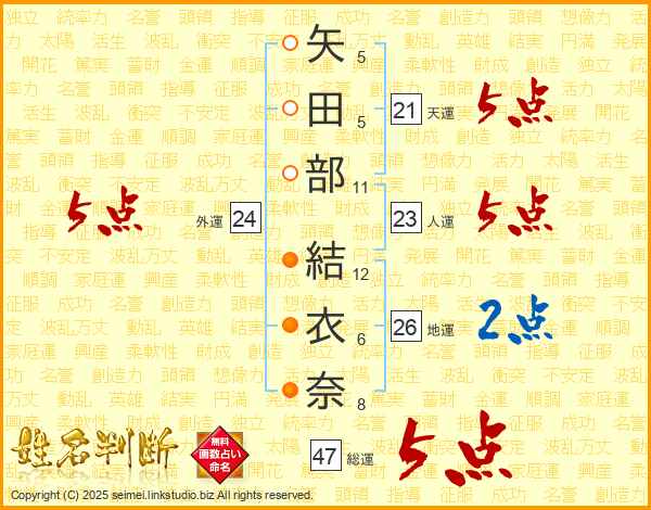矢(5画)田(5画)部(11画) 結(12画)衣(6画)奈(8画)