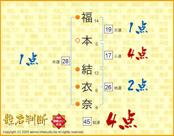 福(14画)本(5画) 結(12画)衣(6画)奈(8画)