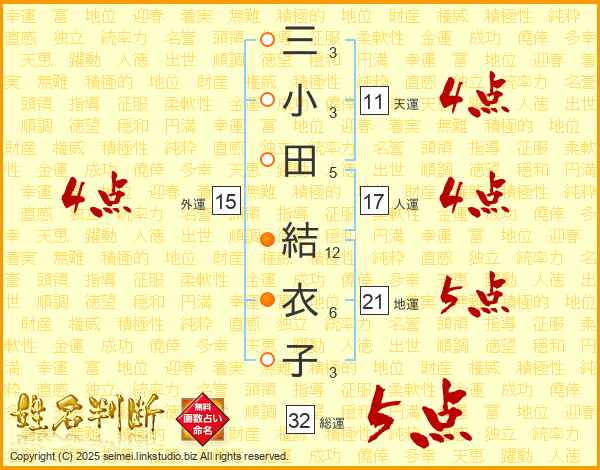 三(3画)小(3画)田(5画) 結(12画)衣(6画)子(3画)