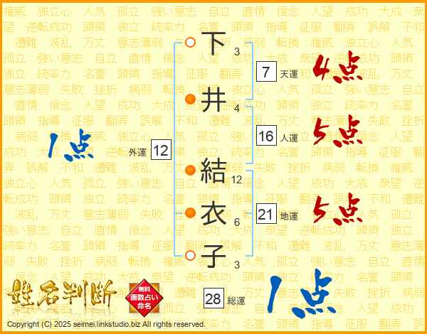 下井結衣子さんの総運は28画の1点