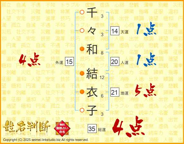 千々和結衣子さんの総運は35画の4点!