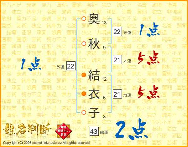 奥秋結衣子さんの総運は43画の2点!