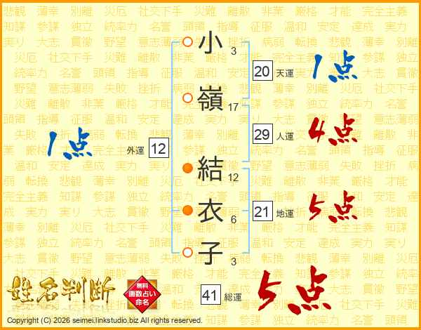 小(3画)嶺(17画) 結(12画)衣(6画)子(3画)