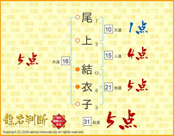 尾(7画)上(3画) 結(12画)衣(6画)子(3画)