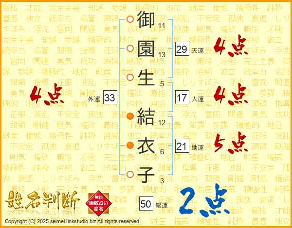 御(11画)園(13画)生(5画) 結(12画)衣(6画)子(3画)