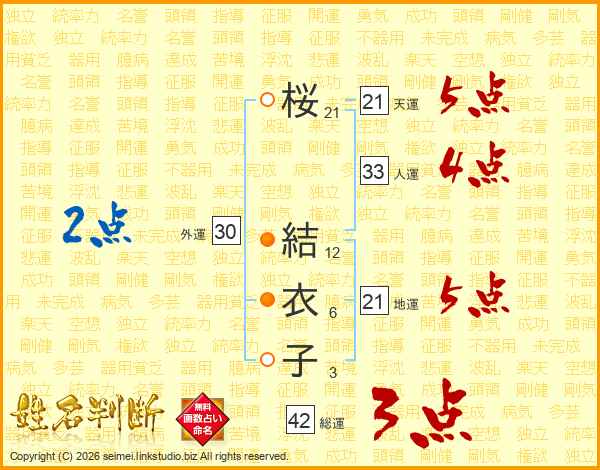 桜(21画) 結(12画)衣(6画)子(3画)