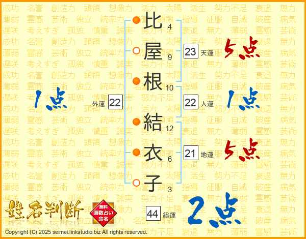 比(4画)屋(9画)根(10画) 結(12画)衣(6画)子(3画)