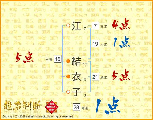 生活面を象徴する運勢です。外部から受ける影響力を表し、結婚運、家庭運や職場、環境への順応性を表します。総運から人運を引いた画数。姓や名が1文字の場合を除く。