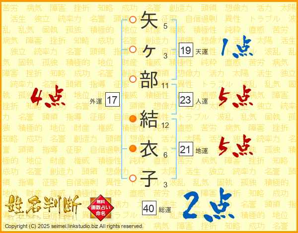 矢(5画)ヶ(3画)部(11画) 結(12画)衣(6画)子(3画)