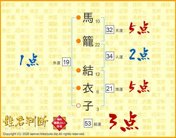 生活面を象徴する運勢です。外部から受ける影響力を表し、結婚運、家庭運や職場、環境への順応性を表します。総運から人運を引いた画数。姓や名が1文字の場合を除く。