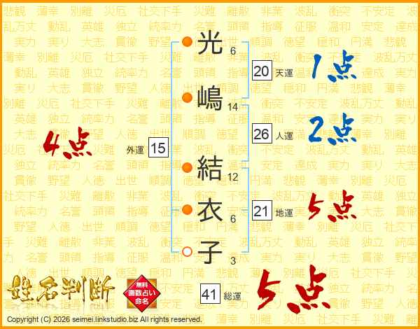 光(6画)嶋(14画) 結(12画)衣(6画)子(3画)