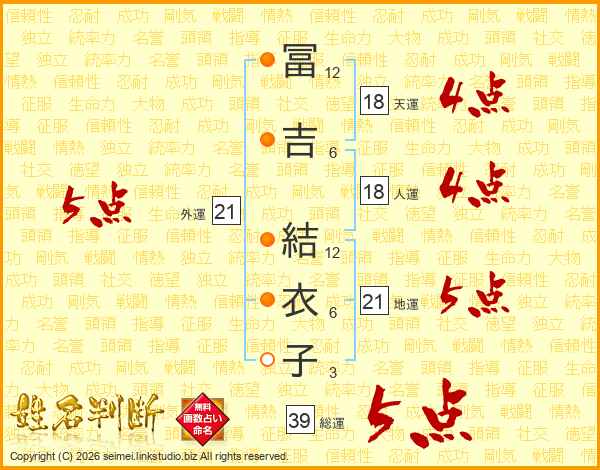 冨(12画)吉(6画) 結(12画)衣(6画)子(3画)