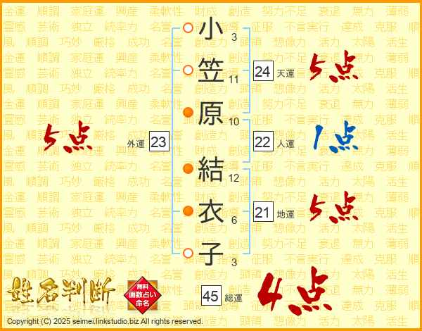 小(3画)笠(11画)原(10画) 結(12画)衣(6画)子(3画)