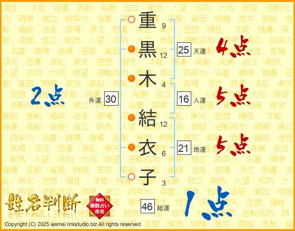 重(9画)黒(12画)木(4画) 結(12画)衣(6画)子(3画)