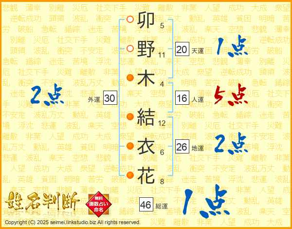 卯(5画)野(11画)木(4画) 結(12画)衣(6画)花(8画)