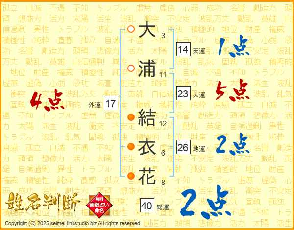 大(3画)浦(11画) 結(12画)衣(6画)花(8画)