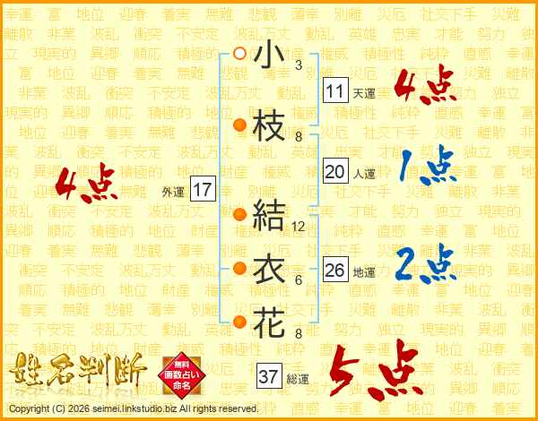 小枝結衣花さんの総運は37画の5点!