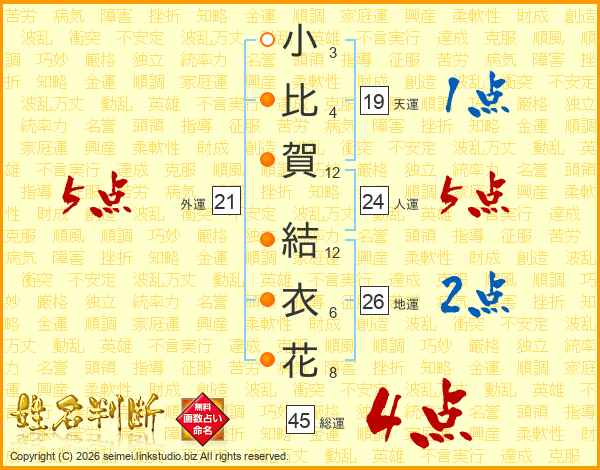 小(3画)比(4画)賀(12画) 結(12画)衣(6画)花(8画)
