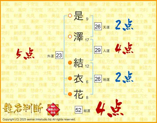 是(9画)澤(17画) 結(12画)衣(6画)花(8画)