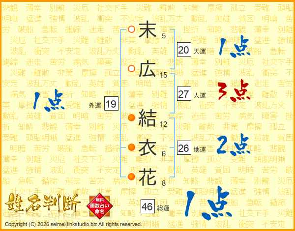 末(5画)広(15画) 結(12画)衣(6画)花(8画)