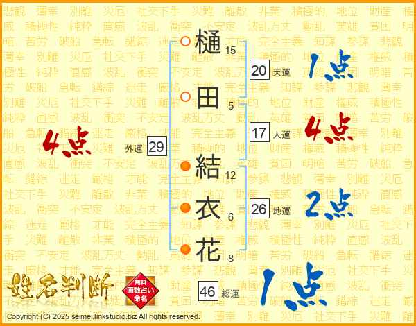 樋(15画)田(5画) 結(12画)衣(6画)花(8画)