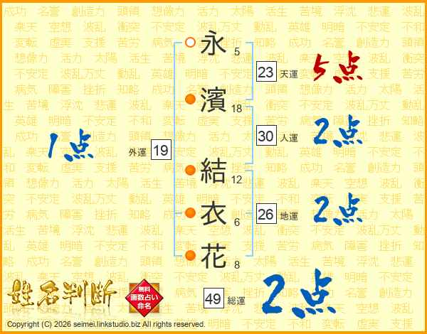 永(5画)濱(18画) 結(12画)衣(6画)花(8画)