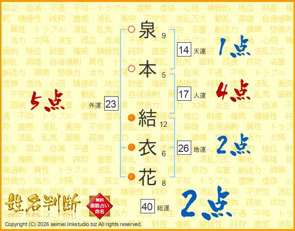 泉(9画)本(5画) 結(12画)衣(6画)花(8画)
