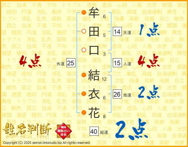 牟(6画)田(5画)口(3画) 結(12画)衣(6画)花(8画)