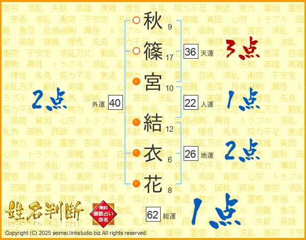 秋篠宮結衣花さんの総運は62画の1点!