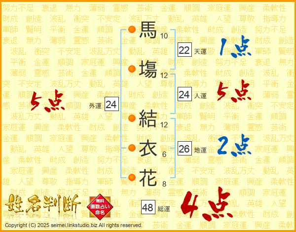 馬(10画)塲(12画) 結(12画)衣(6画)花(8画)